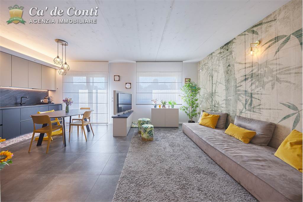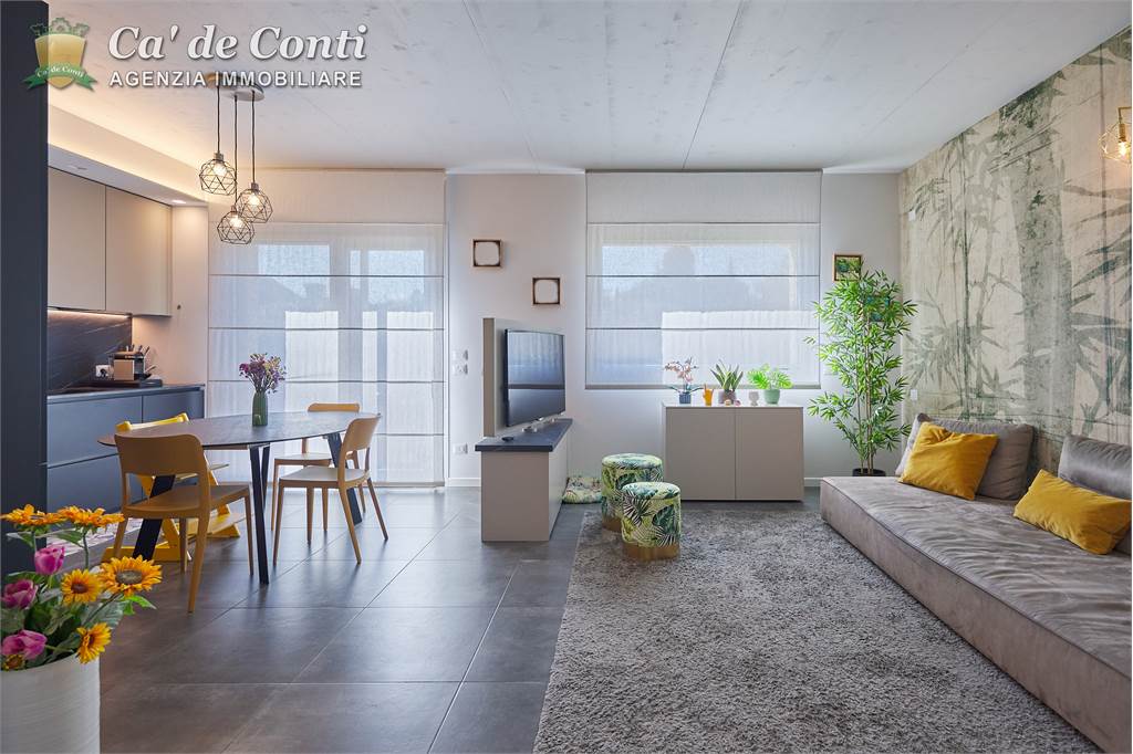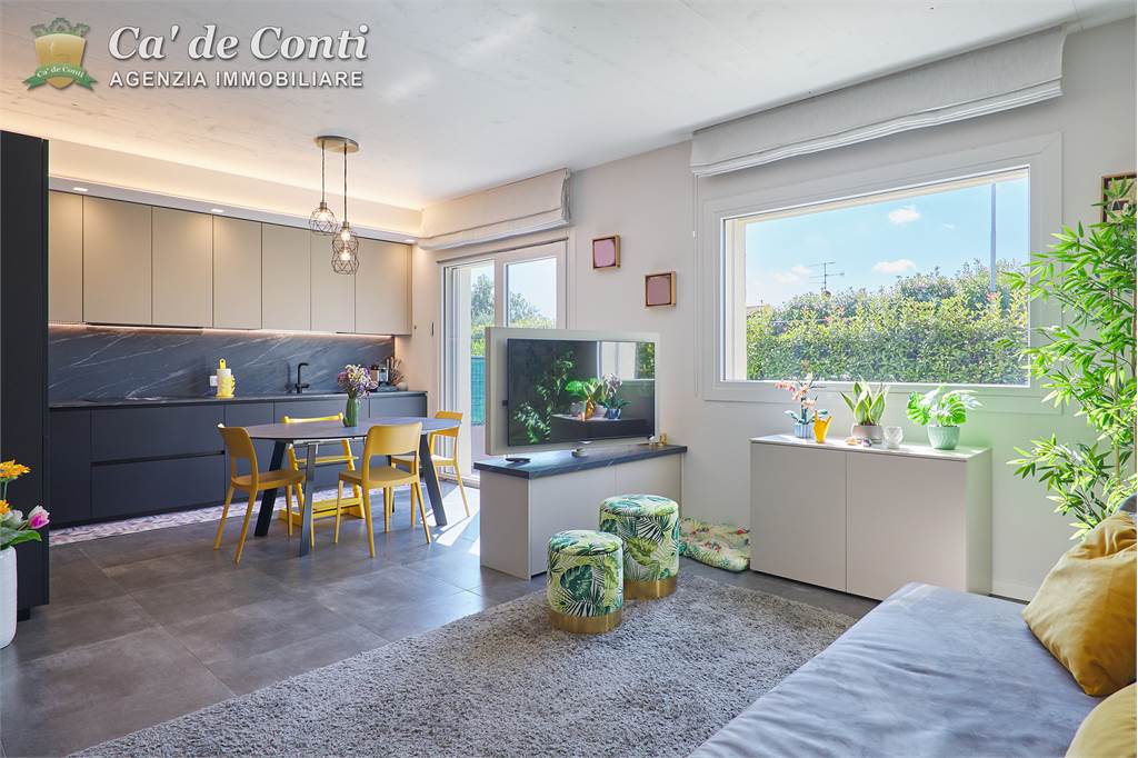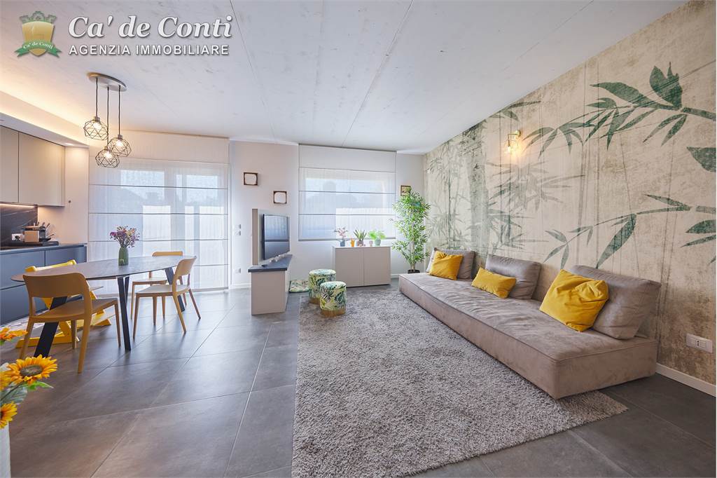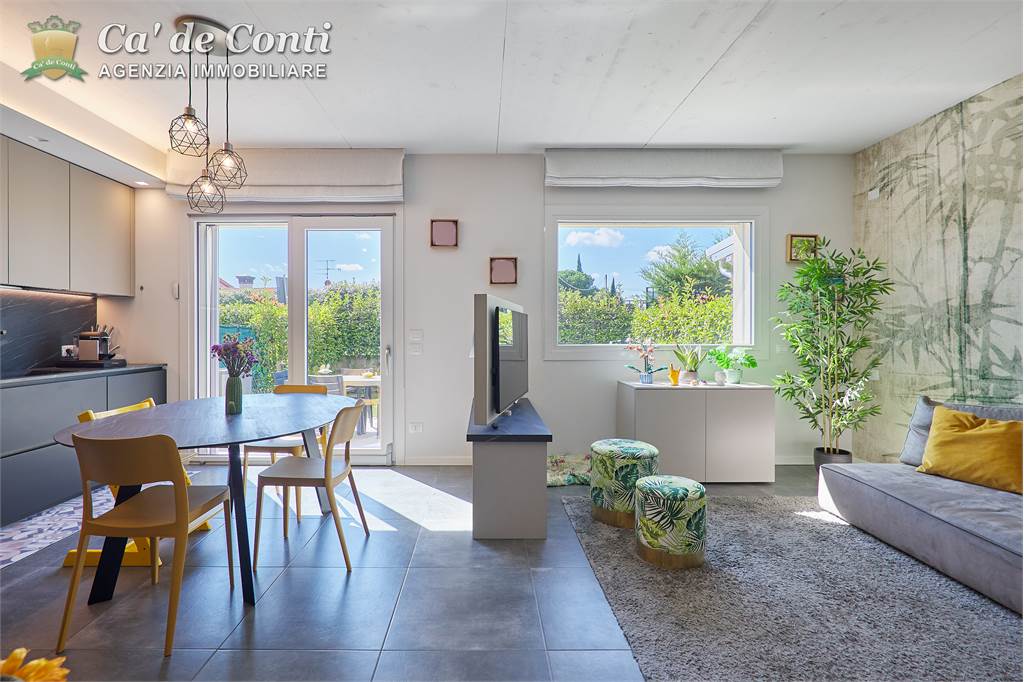 Zona Giorno Open Space: Ampio soggiorno con grande vetrata scorrevole affacciata sul giardino privato. Elegante cucina a vista di design, completa di arredi su misura.