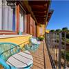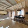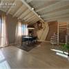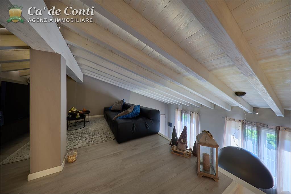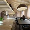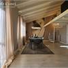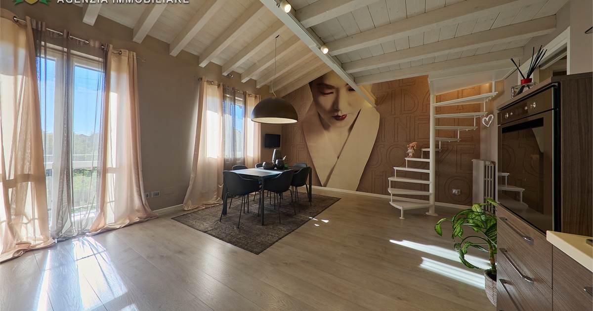 La zona giorno open space accoglie soggiorno, pranzo e cucina, con doppia vetrata che si apre sulla balconata affacciata sulle colline circostanti. Il living è impreziosito dagli alti soffitti con travi a vista sbiancate e dall’elegante soppalco a sbalzo sulla zona giorno, perfetto come area relax o studio privato.
